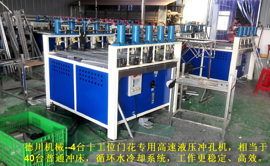 德川機械--4臺十工位門花專用高速液壓沖孔機,相當(dāng)于40臺普通沖床,循環(huán)水冷卻系統(tǒng),工作更穩(wěn)定、高效。...