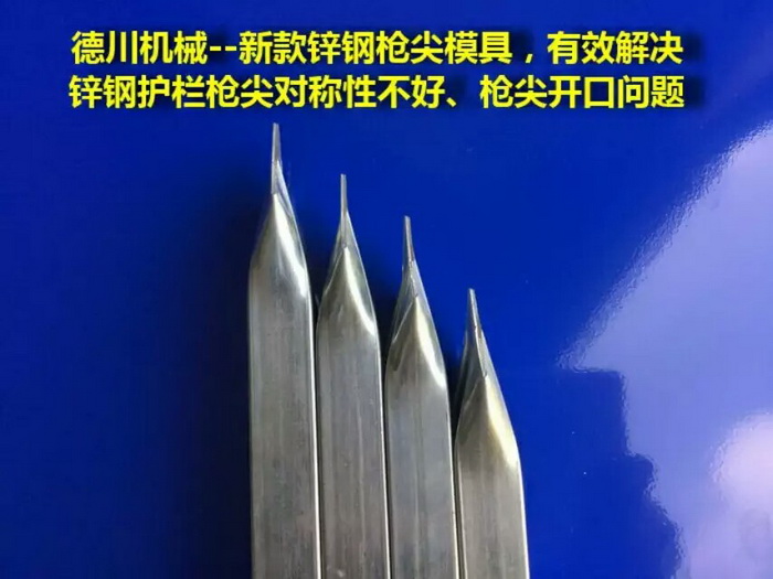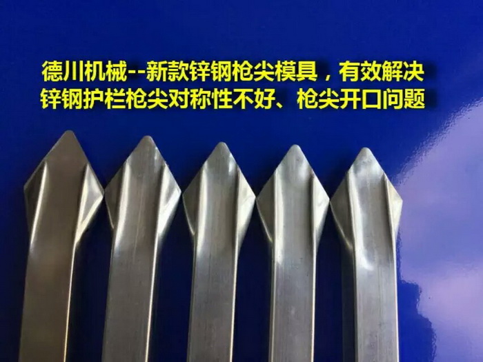 德川機械--專業鋅鋼護欄設備研發與制造,壓槍尖模具一次成型,廢料自動排出,無需人工排出廢料,效率高、操作安全,壓出來的槍尖外觀好。