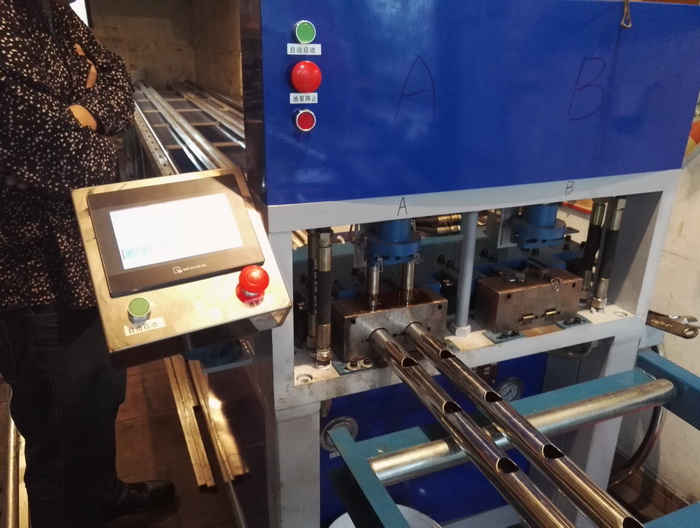 數(shù)控全自動(dòng)樓梯沖孔機(jī),兩工位同時(shí)工作,一次沖四支管,每個(gè)油缸可單獨(dú)控制沖全孔、半孔,大大提高樓梯圓管沖孔效率。