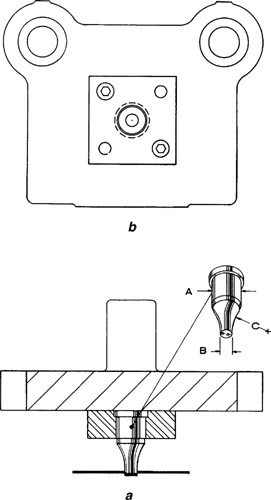 主體直徑a遠大于沖裁直徑B;半徑C提供支撐材料,以提供剛性,并防止沖頭在接觸材料帶時發生偏轉。剖面圖a顯示了沖頭、沖頭板和沖頭支架,它們將出現在整個模具圖紙的左下剖面圖中。