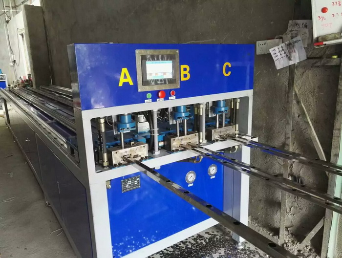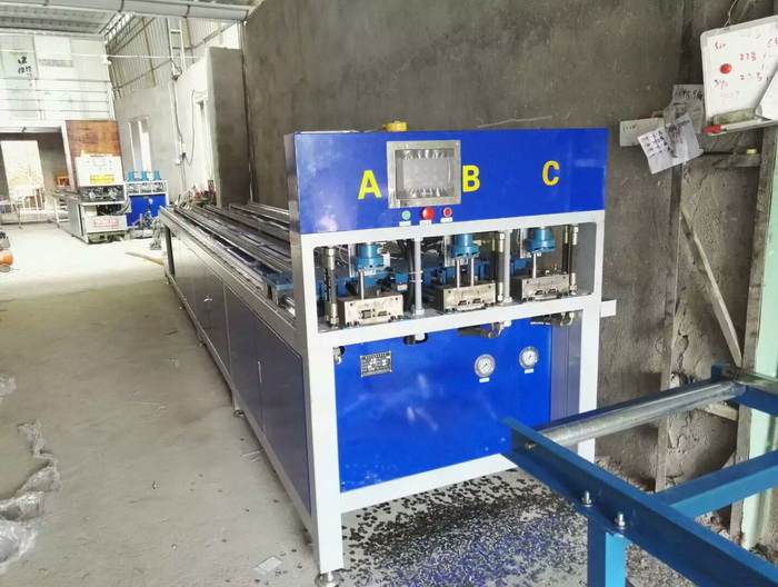 三工位數控全自動沖孔機,漳州用戶使用現場,最多一次沖6支管,每個油缸可獨立控制全孔或半孔,一次完成一個防盜窗沖孔加工,效率更高。