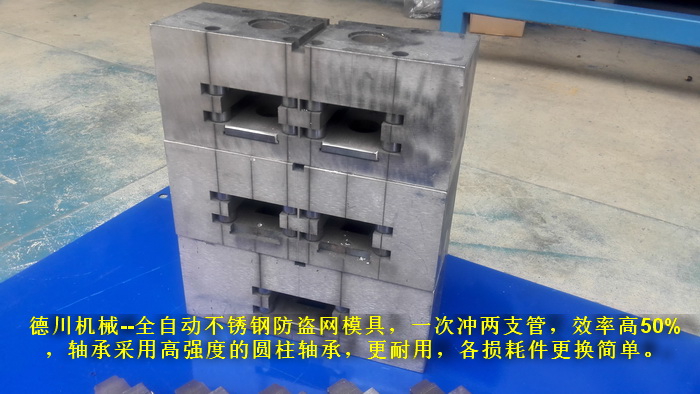 全自動(dòng)不銹鋼防盜網(wǎng)模具,一次沖兩支管,效率高50%,軸承采用高強(qiáng)度的圓柱軸承,更耐用,各損耗件更換簡單。