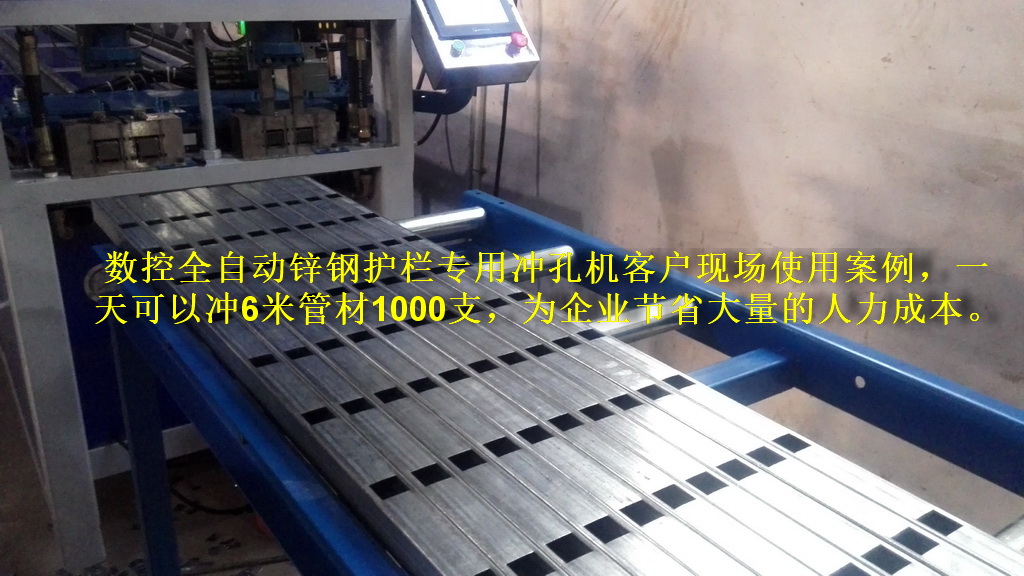 我司在管材沖孔設(shè)備多年的技術(shù)積累、良好的品牌效應(yīng)的基礎(chǔ)上研發(fā)出新一代兩工位數(shù)控全自動(dòng)液壓沖孔機(jī),比市場(chǎng)上同類型產(chǎn)品效率高50%,提高管材加工企業(yè)的效率,增加企業(yè)的競(jìng)爭力;主要具有如下特點(diǎn):一次可以同時(shí)沖4支管,最高速度可以達(dá)到每秒鐘沖3個(gè)孔,一天可以沖6米管材1000支、防盜網(wǎng)1000平方;一支管上可沖雙面孔、單面孔,兩工位可以同時(shí)控制,也可以分開獨(dú)立控制;采用人性化人機(jī)交互操作界面,不需要專業(yè)人員編程,可任意控制沖等距或不等距孔;各種型號(hào)沖孔參數(shù)可保存在系統(tǒng)內(nèi),用時(shí)只需要調(diào)出參數(shù)即可;可根據(jù)客戶使用要求增加自動(dòng)切料系統(tǒng),可以同時(shí)進(jìn)行自動(dòng)沖孔、切料工作;系統(tǒng)完全自主研發(fā),可根據(jù)客戶的要求增加不同的功能;裝模、換模簡單,機(jī)臺(tái)上有定位裝置,模具對(duì)準(zhǔn)定位裝置后鎖緊螺絲即可;廣泛應(yīng)用于不銹鋼、防盜網(wǎng)、護(hù)欄、貨架、金屬家具、汽車配件、建筑材料生產(chǎn)企業(yè)等五金管件、型材沖孔、開料加工。